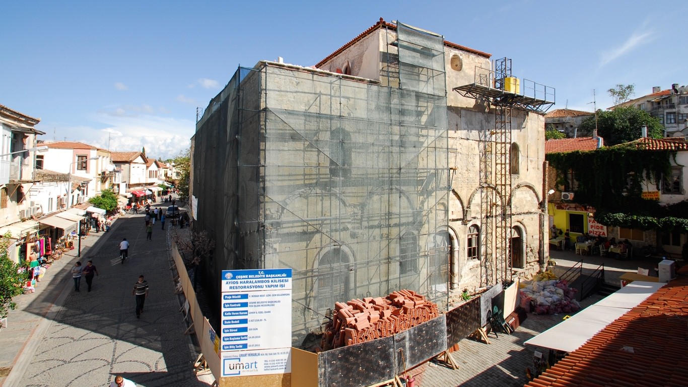 Plan ve süslemeleri açısından özel bir yapı olan kilise, İzmir’ in Çeşme İlçesinde 1832 yılında Aziz Haralambos’ a ithafen yapılmıştır. Bir Rum Ortodoks ibadethanesi olarak inşa edilen kilise Bazilikal Tipli, doğu-batı yönünde uzanan üç nefli, günümüze ulaşamamış kemerli narteksi olan bir plan şemasına sahiptir. Apsis ibadet mekanını vurgulamak adına orta nef yan neflere göre daha yüksek tutulmuştur. Orta nef tonozu üzerinde son derece canlı renklerle işlenmiş, madalyonlar içine alınmış Pantakrator İsa, Aziz Yahya, Meryem ve çocuk İsa tasvirleri yapılmıştır.